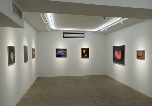 植物や肉、虫などのモチーフは、朽ちようとする一方で、表面の塗料はモチーフの形をなぞり、生の痕跡としてその形を留めようとします。その様子は、薄い塗料の皮膜を隔てて、生と死が背中合わせに存在しているかのように感じられました。